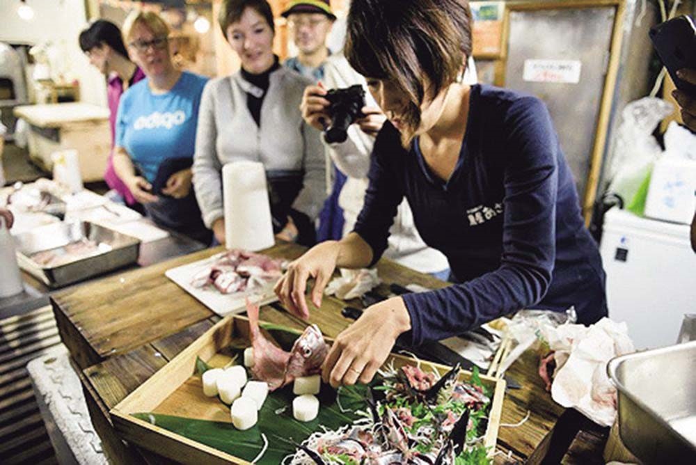 市場で魚を買い、近くの調理場で魚を捌くという、ライブ感あふれる「お魚捌き教室」。有美さんが英語で開催する回は、海外観光客で大盛況。