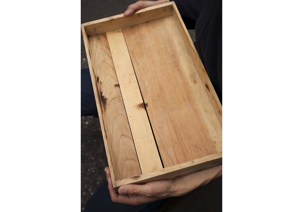 刺身の盛り合わせなどに使う木箱。元々は釜揚げしらすを入れるセイロとして使われていた。尾頭付きを盛るのに丁度よい深さとサイズ。