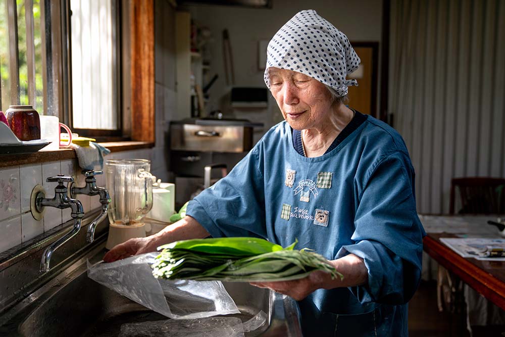 私ね、料理をするための買い物は、ほとんどしないの。畑や山で採れたものが、冷蔵庫にたくさん入ってるからね。昨日はワラビの辛子和えに、アザミのおひたしを作ったよ。息子が山で仕留めてきた鹿肉なんかも食べる。結構いけるよ。昔から山が大好きで、今となってはどこさ何が生えでいるか、だいたいわがってる。辛いことがあっても、山で小鳥のさえずりを聞くと、元気さなれる。