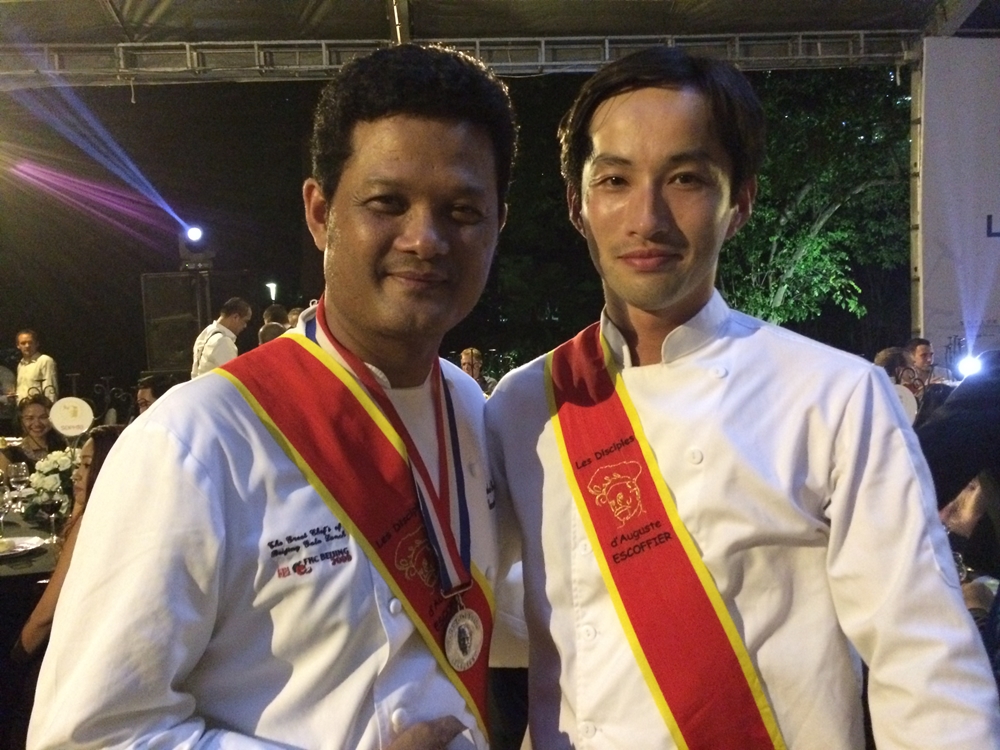 ベトナムのフランス領事館で開催されたエスコフィエ協会ガラパーティーでの、サカール会長との思い出のショット。チーズ職人としての称号が授与され、自らが作ったチーズが晩餐会で供された。