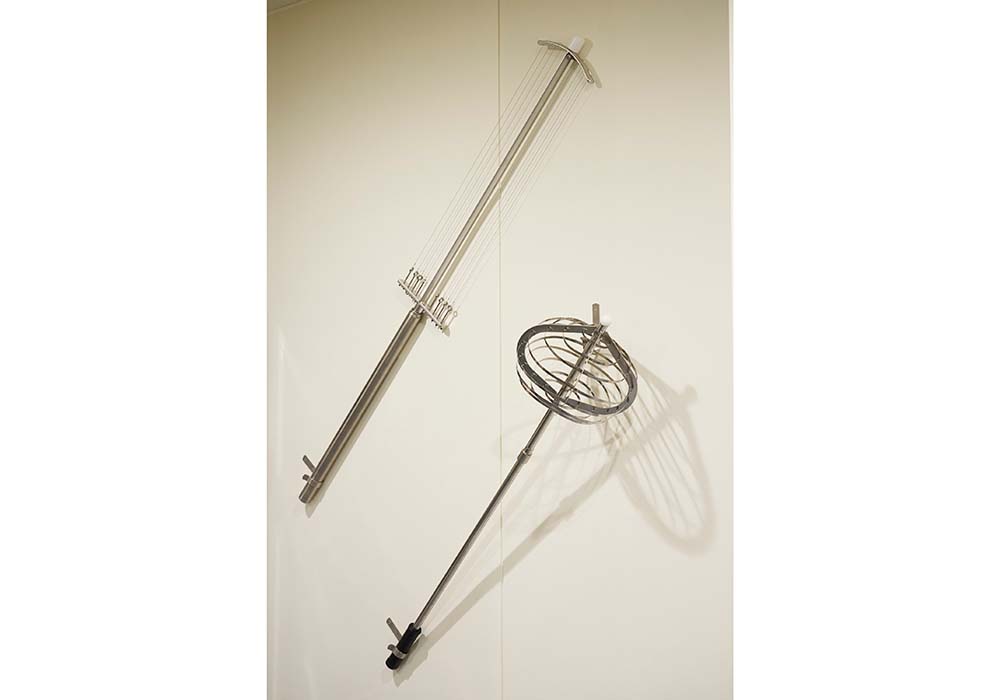 2階チーズ工房横の壁面に架けられたチーズカッター。今は右下のイタリア製を使用しているが、「フランスのハードタイプやラクレットを作るようになったら、左上のフランス製を使う」と久保田さん。