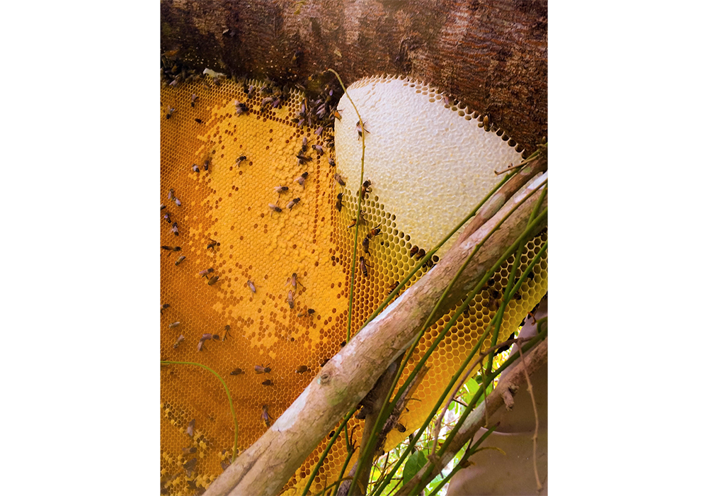 ジャングルのミツバチは、人間の生活圏を嫌い、森の奥深く、人の足で3日ほど入ったエリアに生息し営巣する。時に10数メートルもの高さの木に登り、採取することも。森の自然の営みを壊さぬよう、蜂の巣も1/3しか採らない。