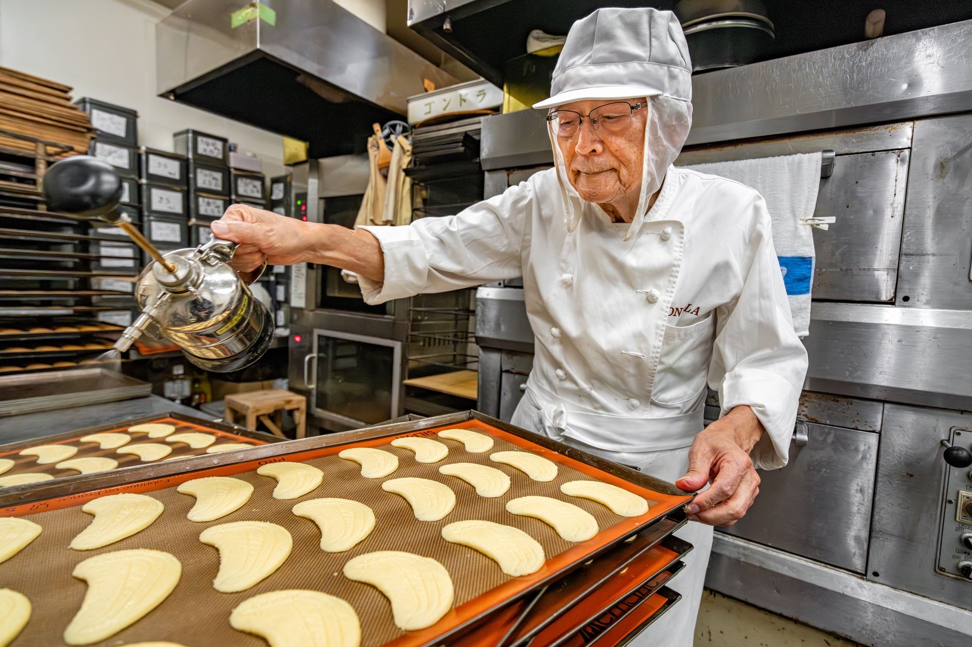 生まれたときから洋菓子に囲まれて育ち、高校卒業後は京都「志津屋」へ。その後、ヨーロッパ修業に1年、スイス、フランス、ドイツ各国で学ぶ。本場の技術、上質の素材にこだわって洋菓子を作るだけでなく、洋菓子業界全体の技術向上に海外との架け橋となって尽力。85歳の現在も、本場の味そのままのサブレや人気のパウンドケーキをはじめ、“本物”を追求し続けている。