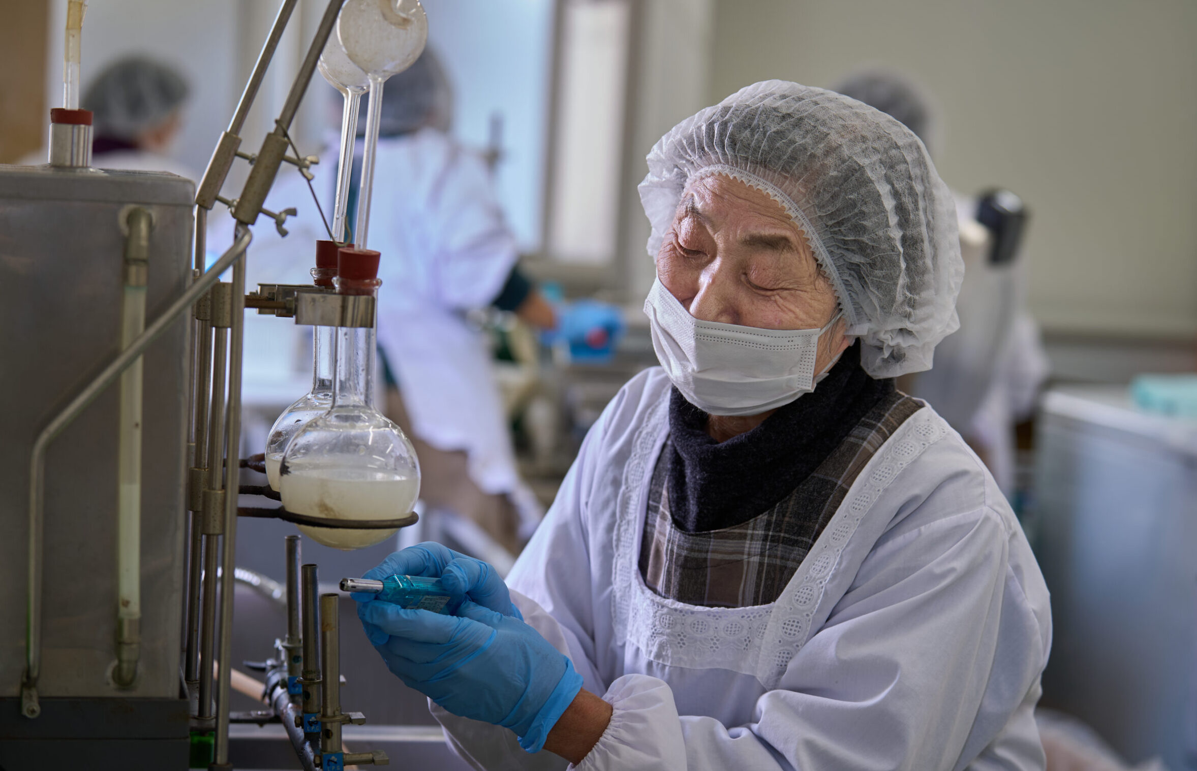 (写真)アルコール度数を計るために、酒を蒸留中の齋藤鈴代さん。合同会社では、齋藤さんを含めて7人の女性が働く。「それぞれの銘柄を好きでおってくれるお客さんから、合同で1つの銘柄を作ることに反対の声もあったけど、続けるためには必要やった」。16年に会社を立ち上げて以来、各生産者の商品も共同で販売する体制になり、外商にも力を入れてきた。