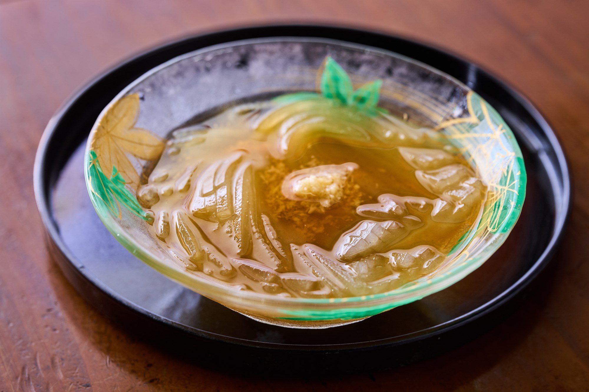 ところてん(¥220)。冷やした鰹だしに地元産の生姜を添えて。爽やかな香りとともにかきこむ鰹だしとところてんは格別の味わい。四万十川源流域の伏流水と、高知産の鰹節、数種のじゃこでだしをとった“つゆ”は、“鰹の一本釣りの町”で知られる久礼だけあって、一般には出回らない枯節の皮の部分を使い、すっきりした旨味と深みのある味わいに。同店のところてんは、100年にわたる久礼の夏の風物詩としても知られている。