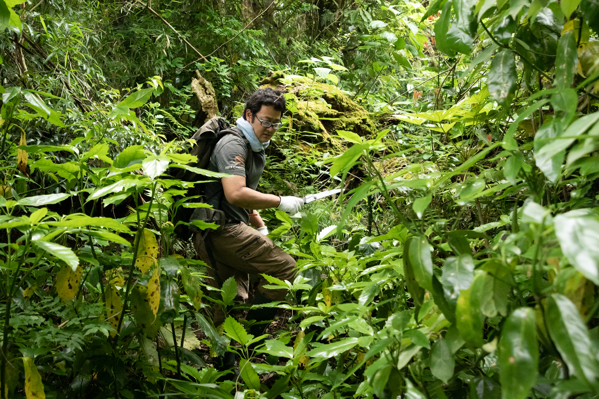 道なき道を突き進む。「地形と植生で把握しているから、ライトがなくても帰れる」と長谷川さん。