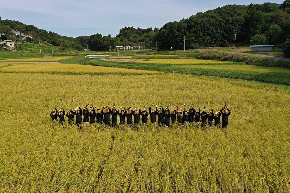 蔵のある田村町金沢地区の自社田では、蔵人総出で自然栽培の酒米作りに取り組む。「ゆくゆくは自社田だけでなく田村町全体を自然派の田んぼにしたい」と仁井田さん。