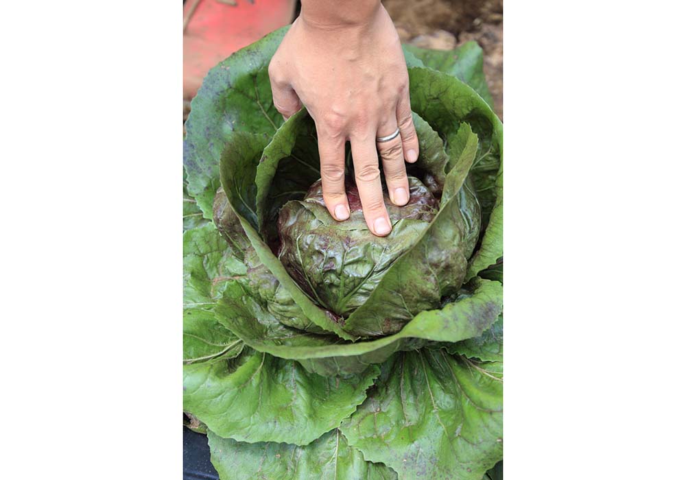 収穫を迎えたトレビス。約1ヘクタールの畑にはロマネスコやカーボロネロなどの西洋野菜のほか、ハーブやスパイスが多品種で少量ずつ栽培されている。肥料は少なめに、ミネラルの力で育てること、ぼかし(微生物)肥料を大切にする点は、師匠の中野さん、浅野さんと同じ。