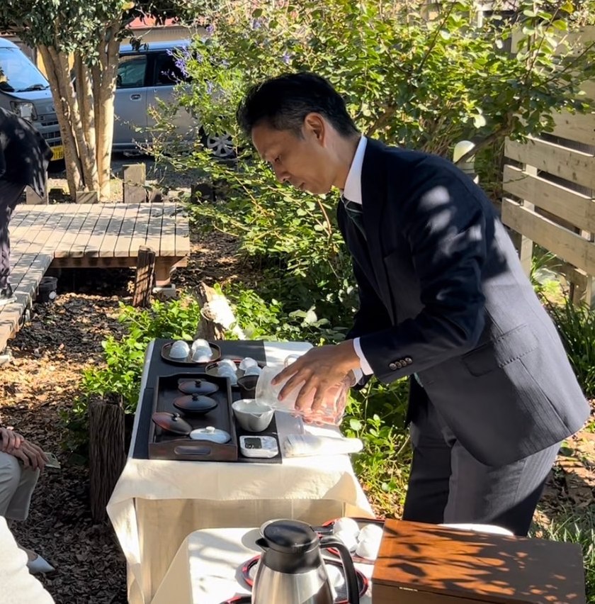 秋晴れの心地よい日。コースが始まる前に、茶畑を前にしたテラス席で手もみ茶を振る舞う「大西園」中島毅さん。畑から抽出まで担う中島さんのプレゼンテーションは、食事をさらに知的な体験に。