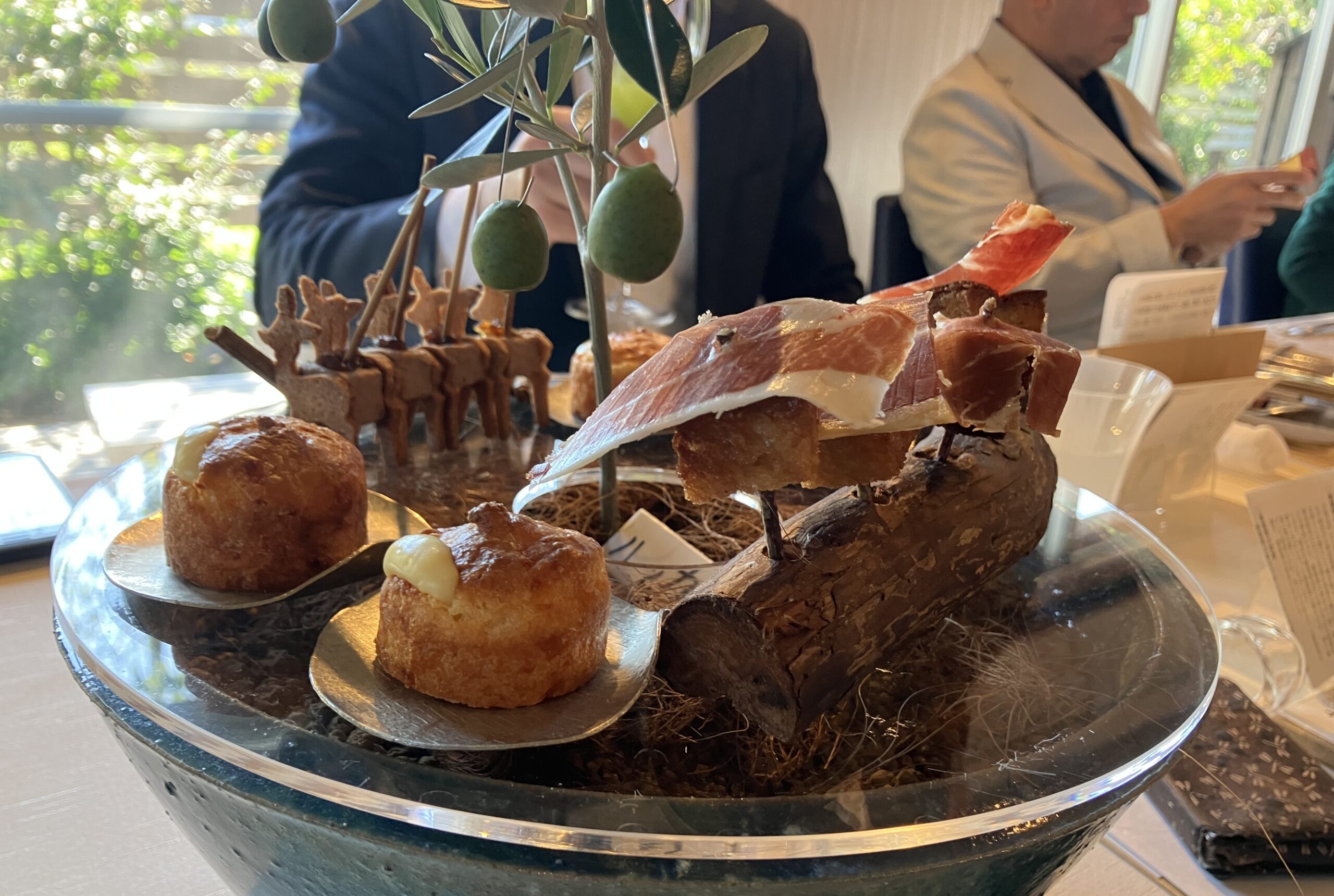 「ウェロニカ・ペルシカ」は、地産地消を深堀りし、土地にすむ酵母菌や歴史、伝統を取り込んだ、”ミクロ”で土地に根付づくフランス料理を提供する。写真は「狭山豊香茶」(後述)とともに提供された前菜。すべて半径30キロ県内の食材を使用。坂戸市セラーノの生ハム、飯能市の地酒「天覧山」の酒粕を練り込んだポンデケージョ、同市吾野の鹿肉のリエット、川越「大野農場」のオリーブの木に摘みたてのミッション種の塩漬け。