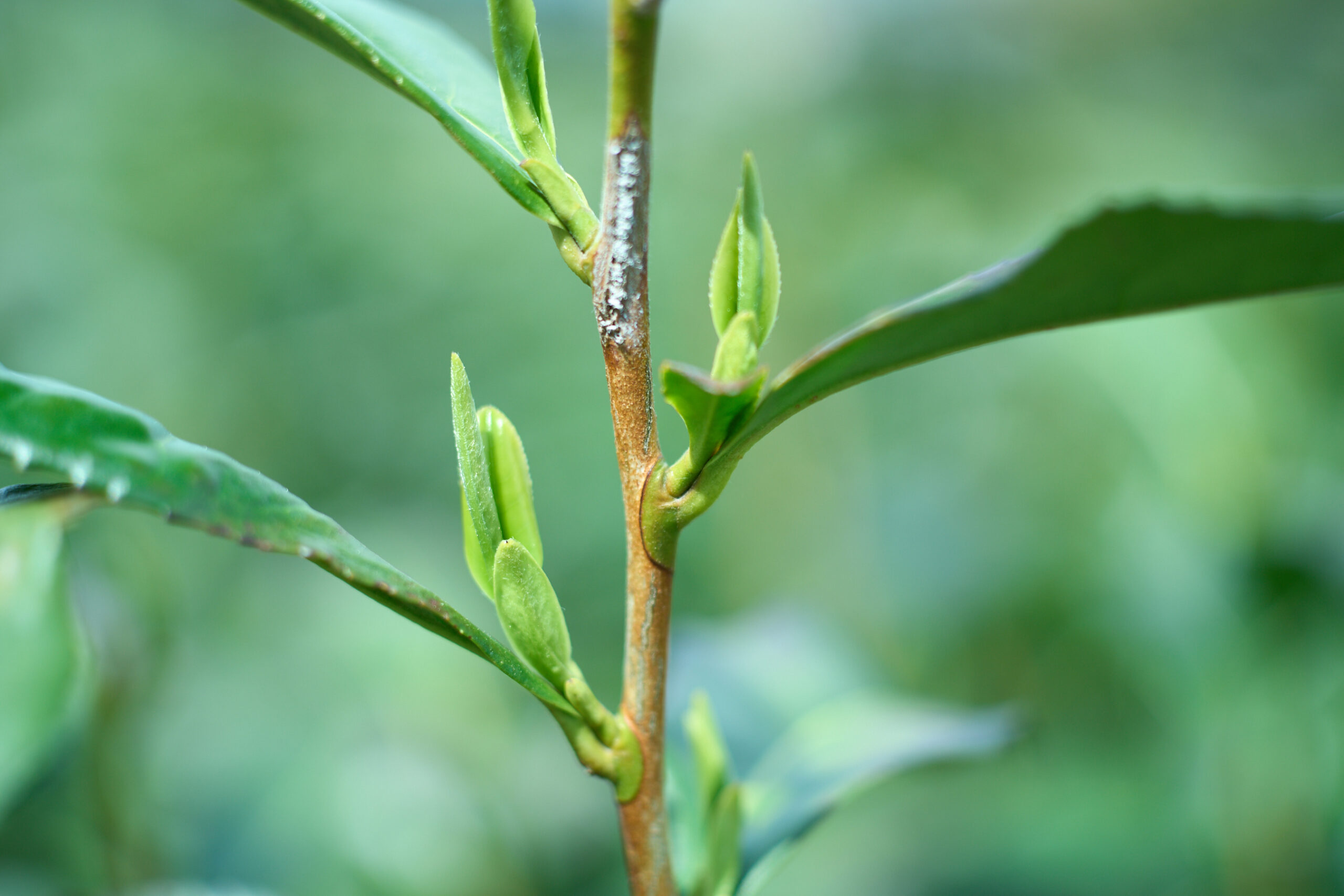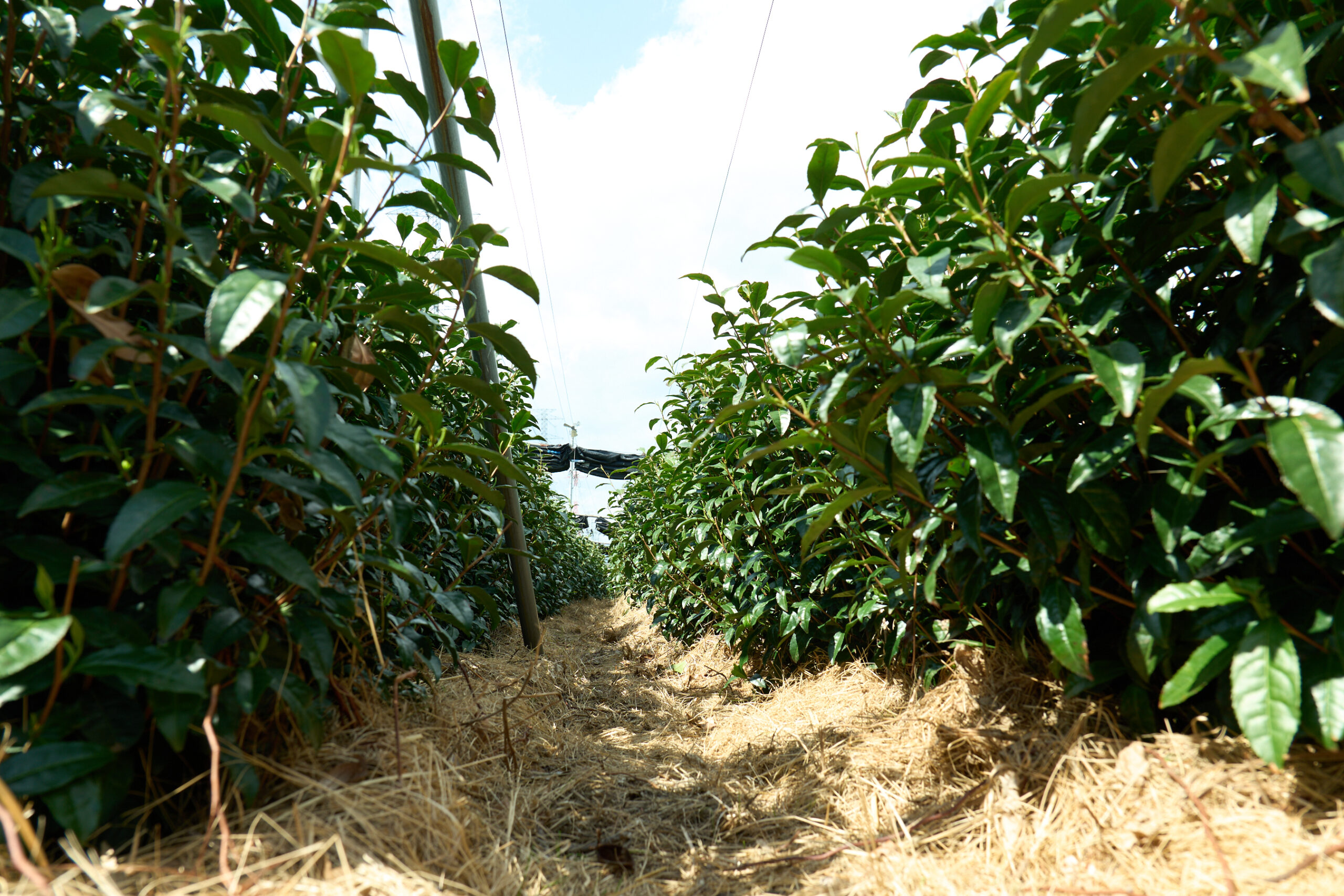 取材日は4月末に控えた茶摘みのシーズンの直前。下の葉が土台となり、土から吸収した栄養を取り込むことで育つ上の新芽を摘む。茶畑は年々背が高くなるが、数年に一度「中切り」を行い、茶木を若返らせる。