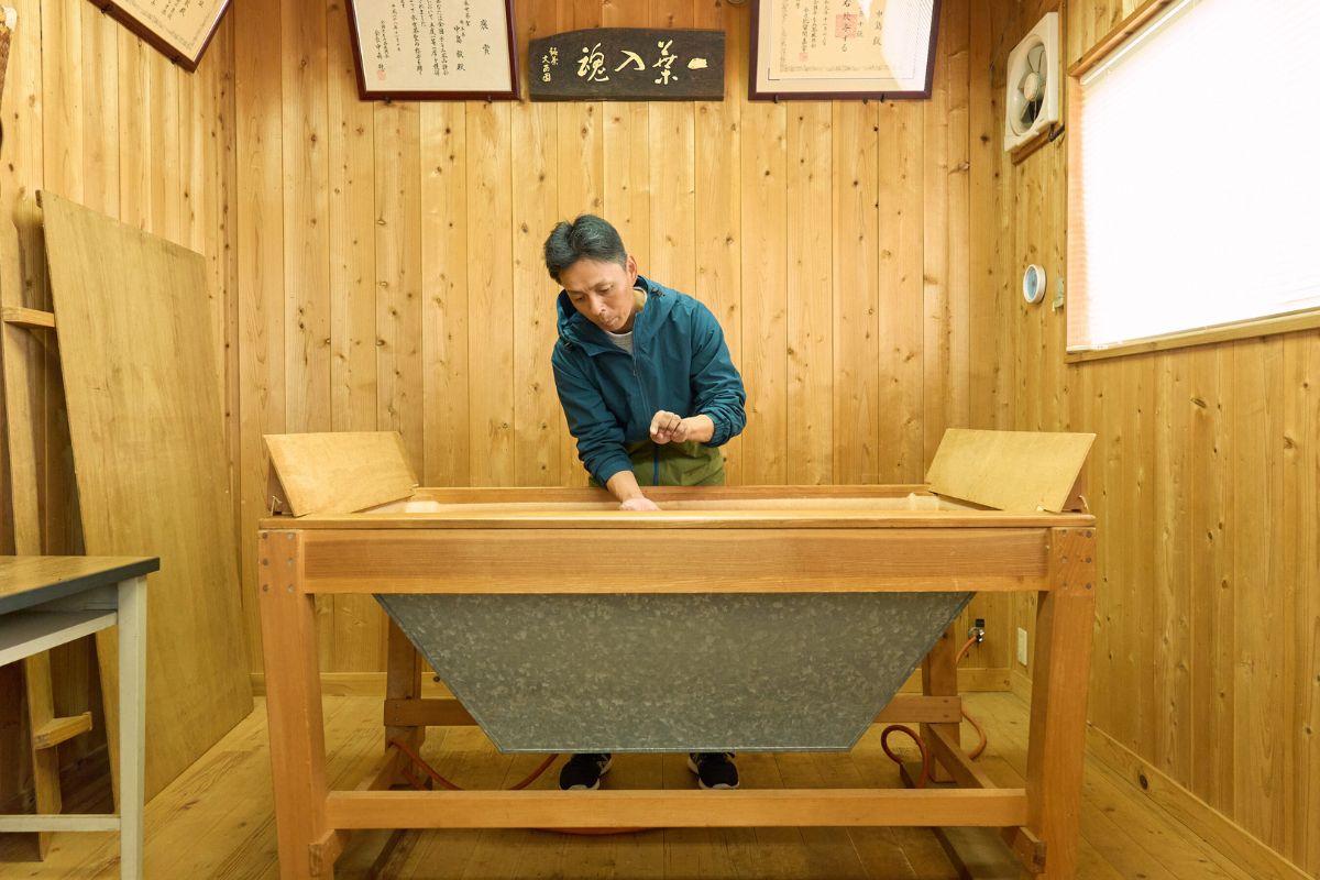 手摘みした茶葉は蒸してから、焙炉(ほいろ)と呼ばれる、下から加温した台の上で、葉をふるう、転がす、撚る、もみ込むなどの作業を施すのだが、中島さんは「道具にもこだわりたい」と、木枠に貼る和紙を厳選。何十種類と集めて実験し、楮(こうぞ)の固さ、厚さ、密度までこだわった岐阜の和紙を用い、自ら貼っている。