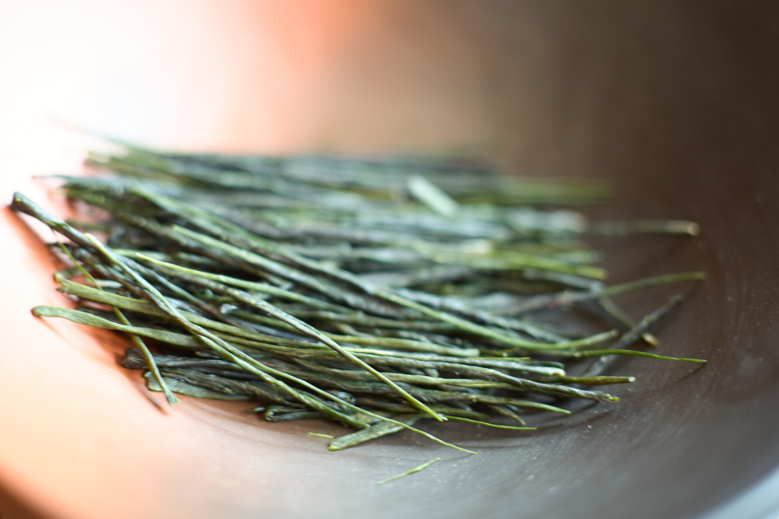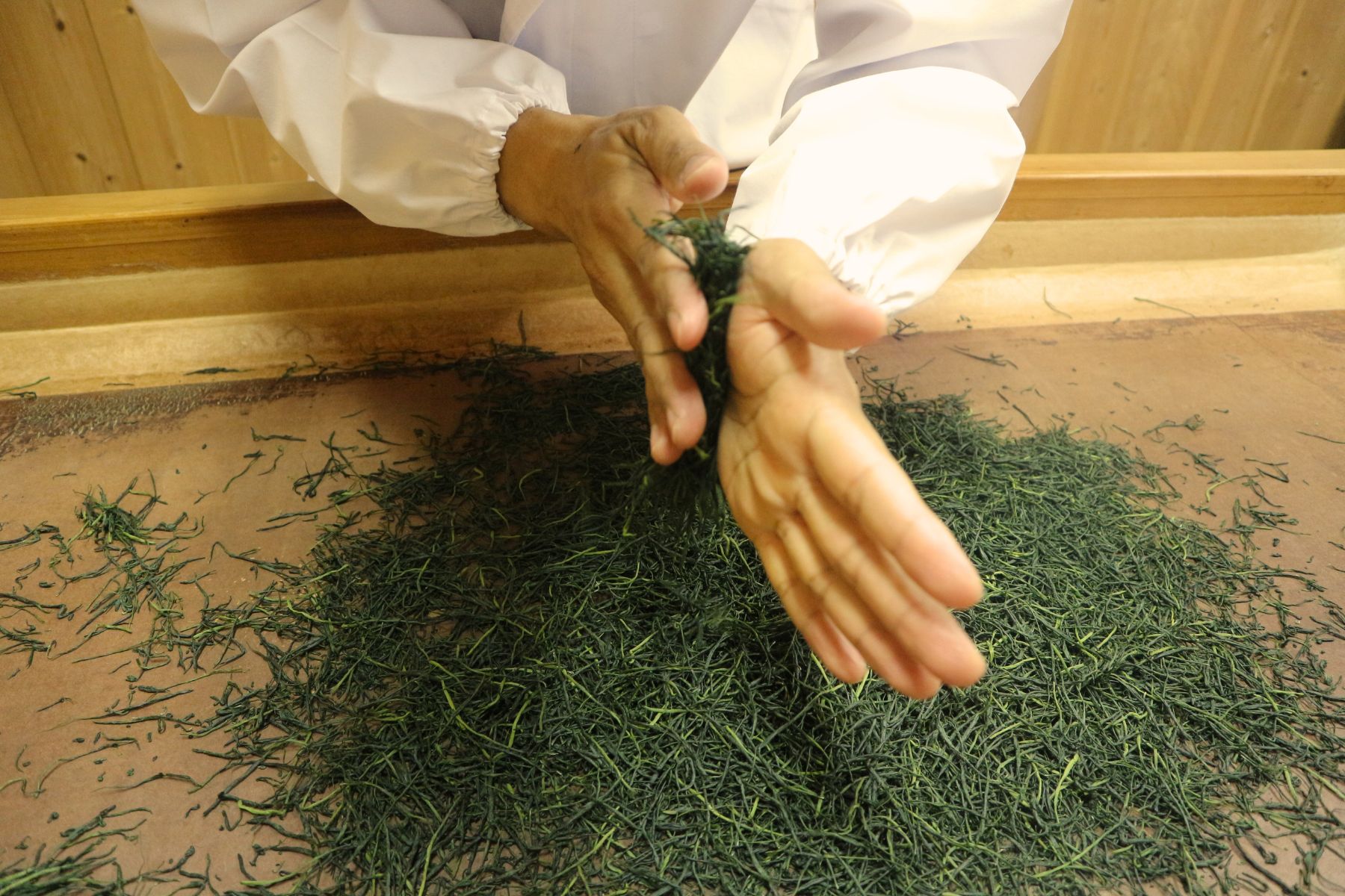 中島さんの手もみ茶。”針金のよう”と評される高級茶の美しいビジュアルは、茶葉の開く速度を遅くさせ、雑味を抑えるという味わいを作るための要素。