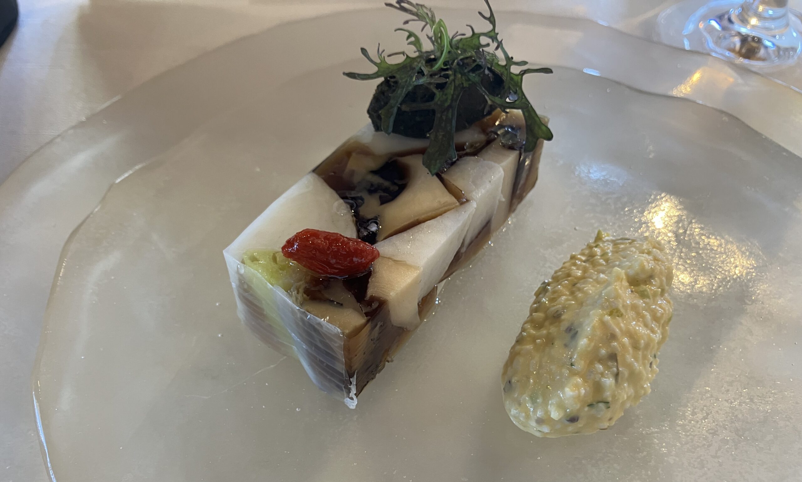 ほうじ茶と合わせた2皿目の前菜。蝦夷アワビを秩父両神山の鹿のコンソメ、シェリー酒、ナツメ、クコ、クローブ、タイムで煮込み、地元の里芋と合わせた。
