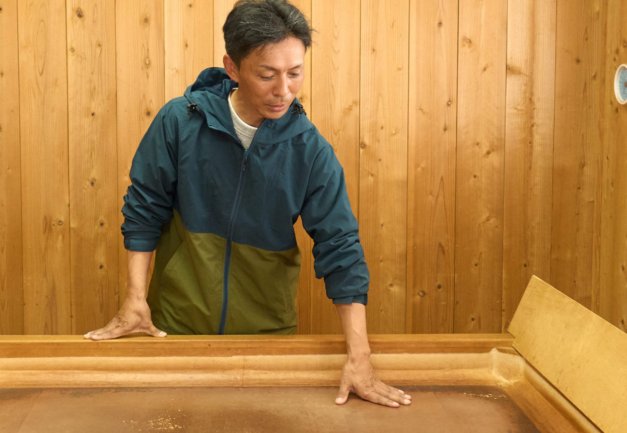手もみ小屋。製茶の作業は、常に中腰で行われるため、体力的に作業できるのは1日1回。「楽をしようと姿勢を起こして、高い位置からもみ込もうとすると、ほいろとの距離がありすぎて茶葉が早く乾き過ぎてしまいます」
