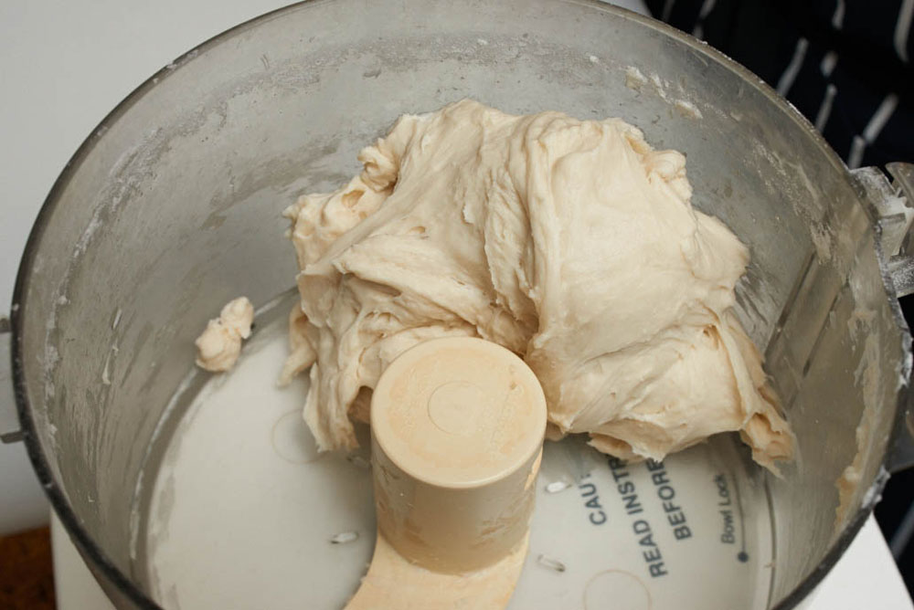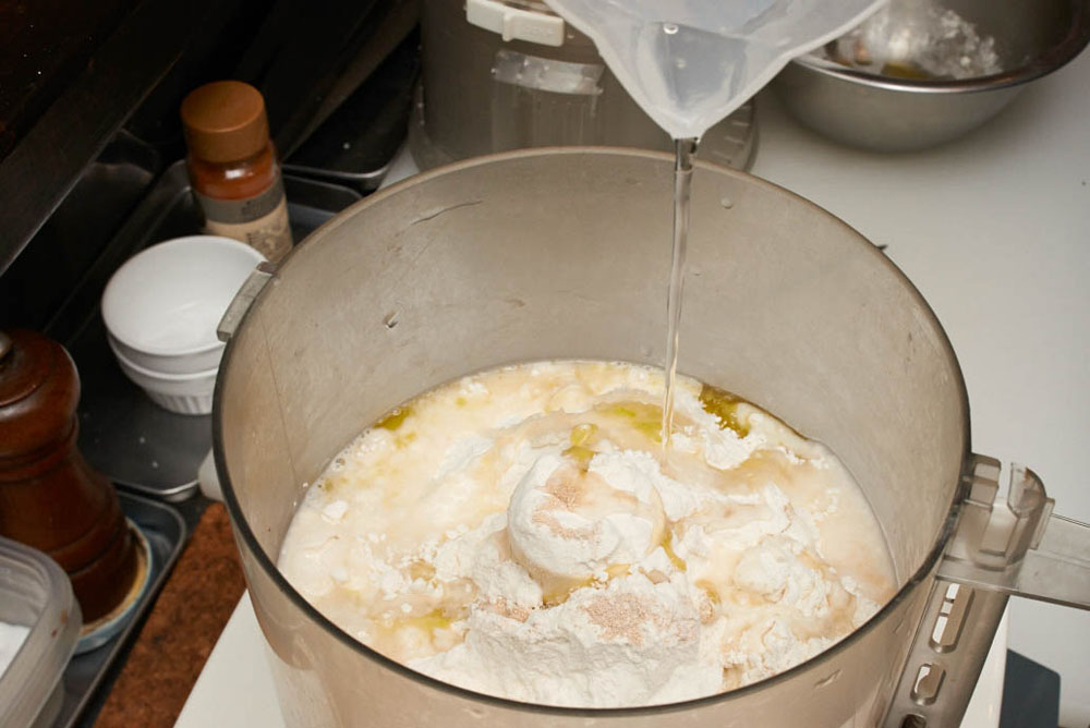 フードプロセッサーに強力粉、ドライイースト、塩、ハチミツ、ぬるま湯を入れて回す。