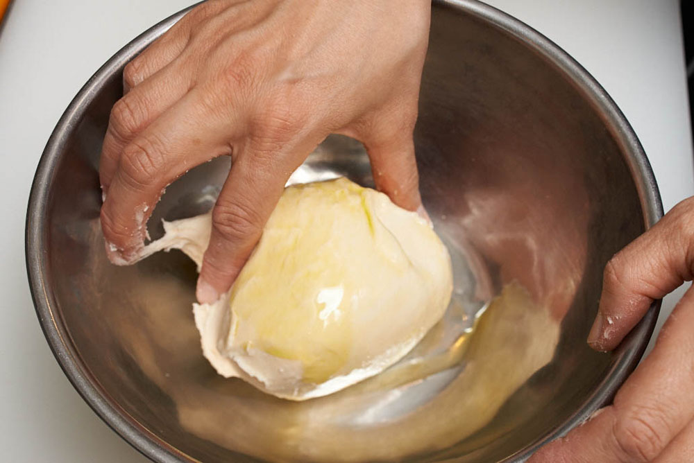 生地がくっつかないようボウルにオリーブ油を入れ、生地の表面にも絡める。ラップで覆って常温で1時間発酵させる。