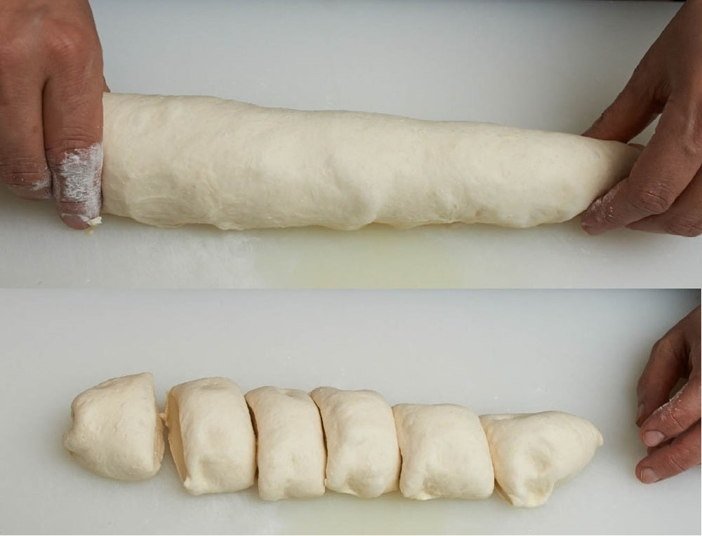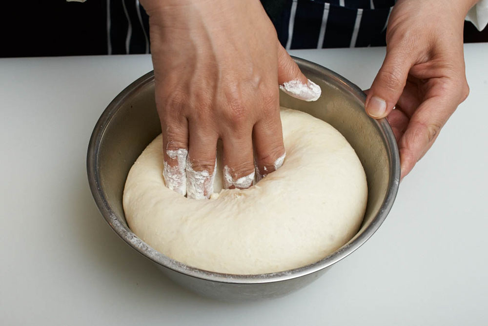 指で押して、生地がすぐ戻るようなら、もうしばらく発酵時間を伸ばす。写真のように押した跡が残り、生地の弾力がなくなればよい。