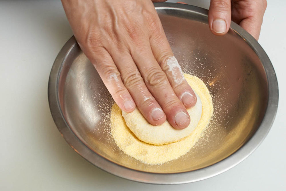 コーングリッツを入れたボウルに丸めた生地を入れ、上から軽く押さえて表面にまぶす。