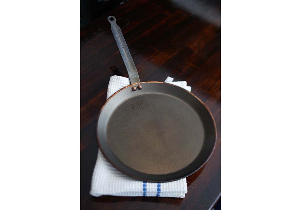 野々下さんは浅くて面の広いクレープパンを愛用。ふつうのフライパンでももちろんOKだが、付きっきりになるので、一度にたくさん焼ける大きさが便利。
