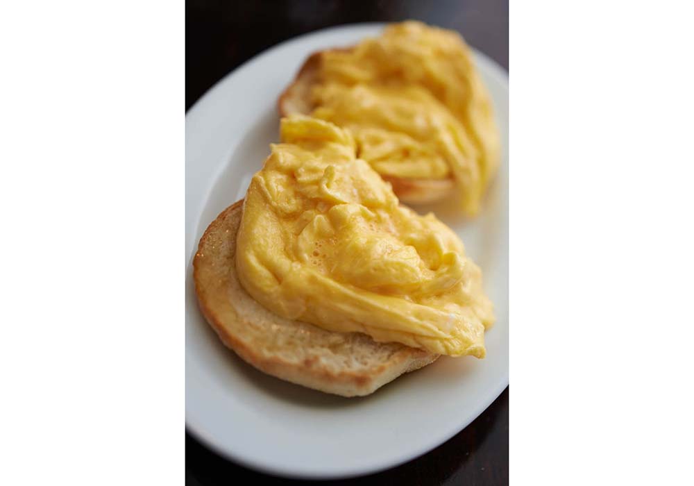 トーストしたイングリッシュマフィンの上に、スクランブルエッグをトッピング。朝食はもちろん、お酒と一緒に夜食でも。