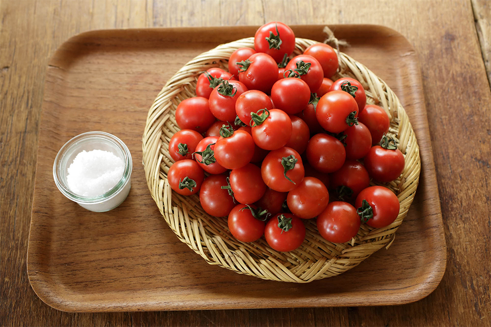 トマトの種類は何でもよいですが、丸のまま瓶の口に入る大きさが作りやすいでしょう。ミディトマトがおすすめ。味が濃く、身質も硬くて扱いやすいですね。家庭菜園でありがちな極小ミニトマトなら、皮をむかず半割にしてそのまま湯煎してしまいます。仕上がりにも変化が出て面白いです。