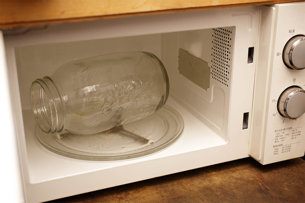水洗いした瓶を煮沸消毒又は電子レンジで5分熱し、乾燥させる。蓋は煮沸あるいはアルコールで消毒する。