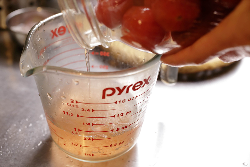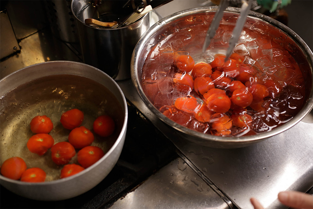 POINT:みずみずしいトマトを使う。皮が弾けやすいのでむきやすい。