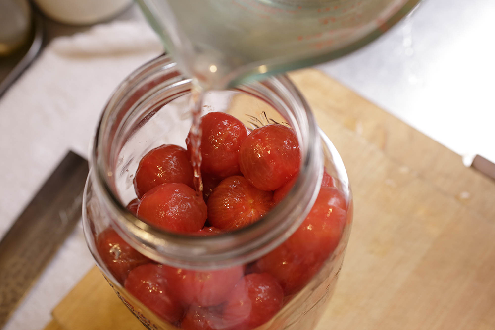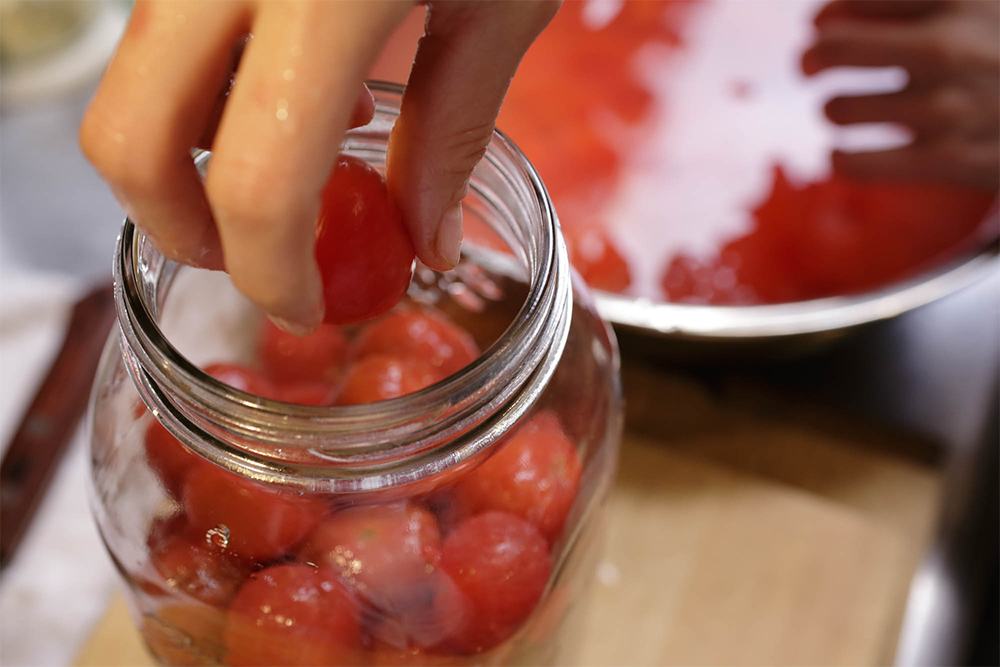 湯むきしたトマトをひと粒ずつ瓶に詰める。
