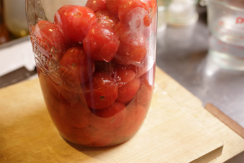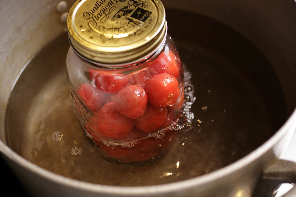 塩分濃度は、0.7%にととのえてください。一般的なトマトの水煮と同じ濃度。料理にも使いやすいでしょう。煮沸は2段階で。まず、瓶内の空気を逃しながら加熱してから、蓋を閉めて本加熱すれば、瓶内の空気が膨張して割れる心配もありません。