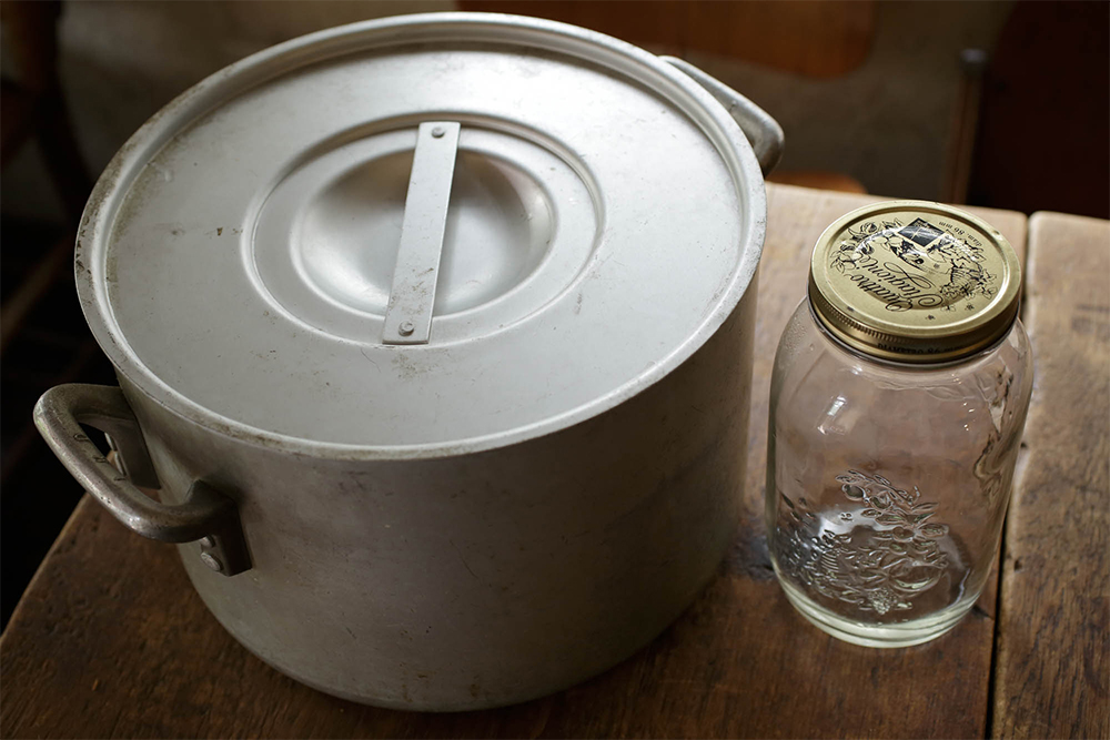 瓶の口を拭き、蓋を半分ほど閉め、鍋に入れる。瓶内の水量がちょうど浸かる程度まで水を張り、10分程度煮る。