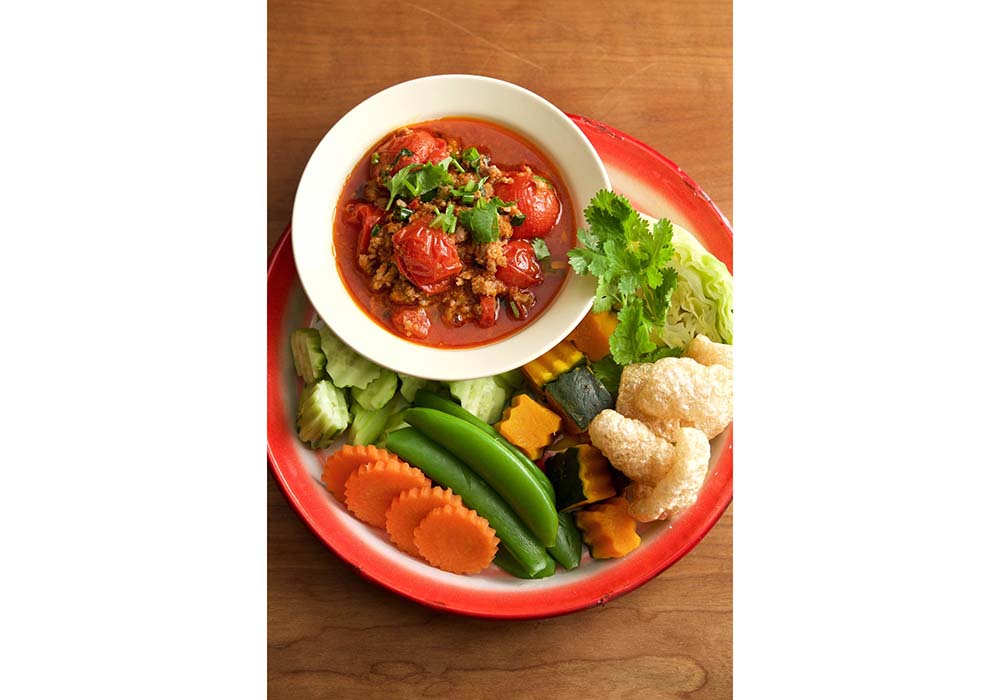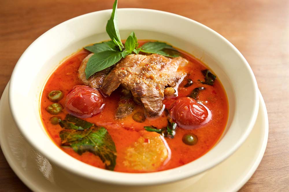 レッドカレーは鮮やかな辛味が持ち味。香ばしく焼いた豚肉に、甘酸っぱいトマトやパイナップルを加えると奥行きが出る。炊いた香り米や茹でた素麺、米麺を添えて。
