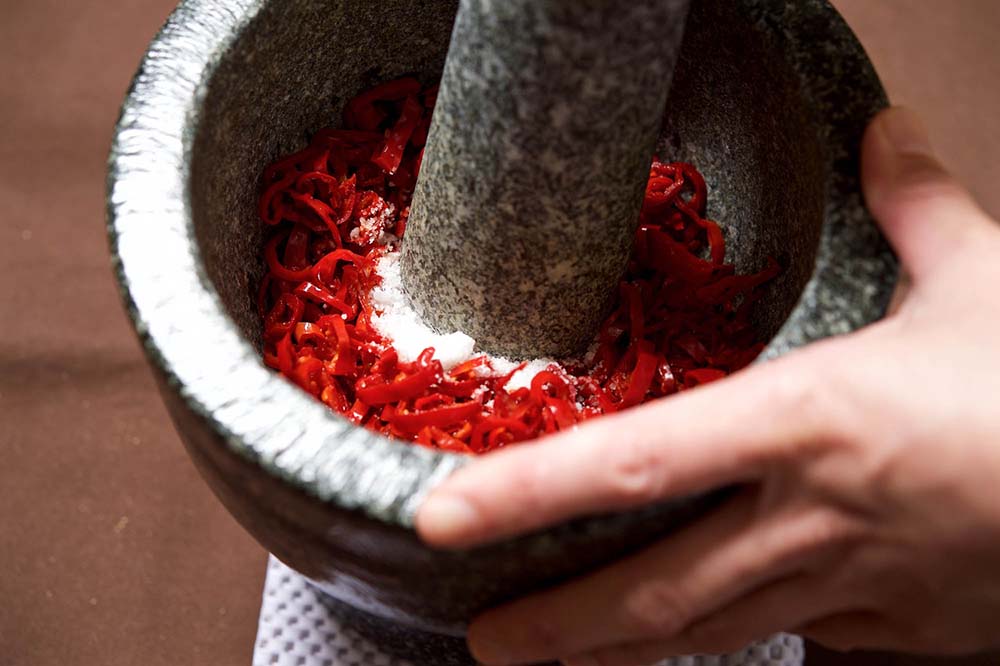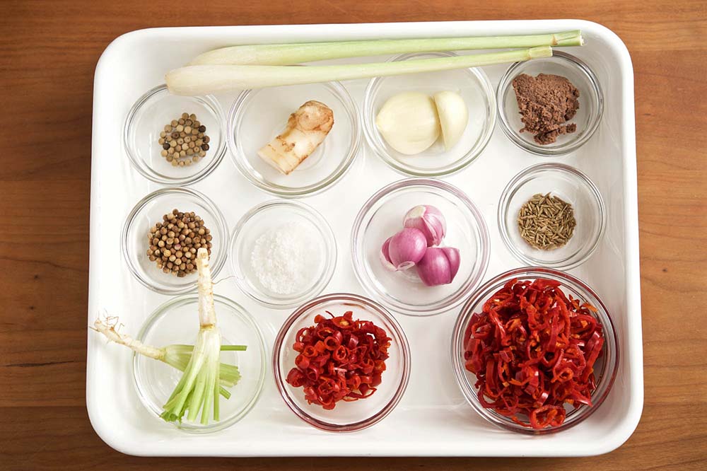 叩き潰す工程が一番大切です。フードプロセッサーでもよいですが、クロック(タイのすり鉢)で作ると香りも舌触りも抜群です。うまく潰すには順番を守ること。乾燥唐辛子はハサミで輪切りにし、水に浸けてやわらかく戻してから最初に潰します。カーやレモングラスは繊維を断つように輪切りにし、ニンニクやホムデン(赤小タマネギ)は丸のまま加えていきます。粒の香辛料は、乾煎りしてから別途すり潰しておき、旨味のベース、カピを混ぜてから最後に加えることで粉スパイスが水分を吸い更に滑らかに潰せます。
