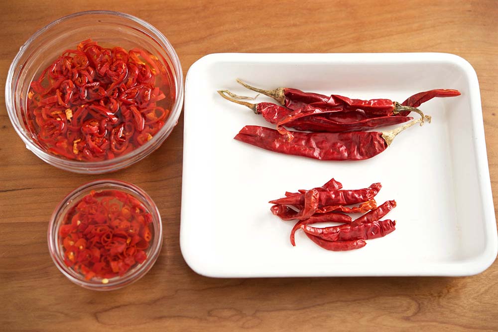 タイカレーは数多くの種類があり、使うハーブや香辛料によって色、香りや辛さが違います。レッドカレーは乾燥赤唐辛子が主役。複雑で奥行きが出るので、辛味と香り豊かな小さなタイ産唐辛子、甘味のある大きなタイ産唐辛子の2種を合わせますが、手に入る唐辛子でよいでしょう。