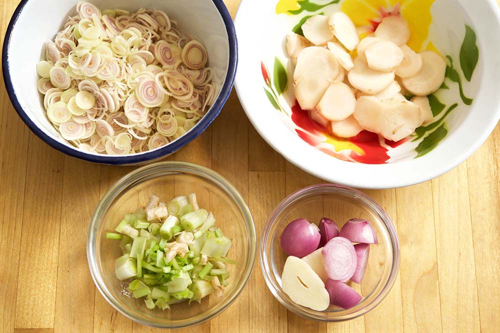 はすべて、繊維を断つように薄く輪切りに。レモングラスは緑色に変わる手前まで。は皮をむく。