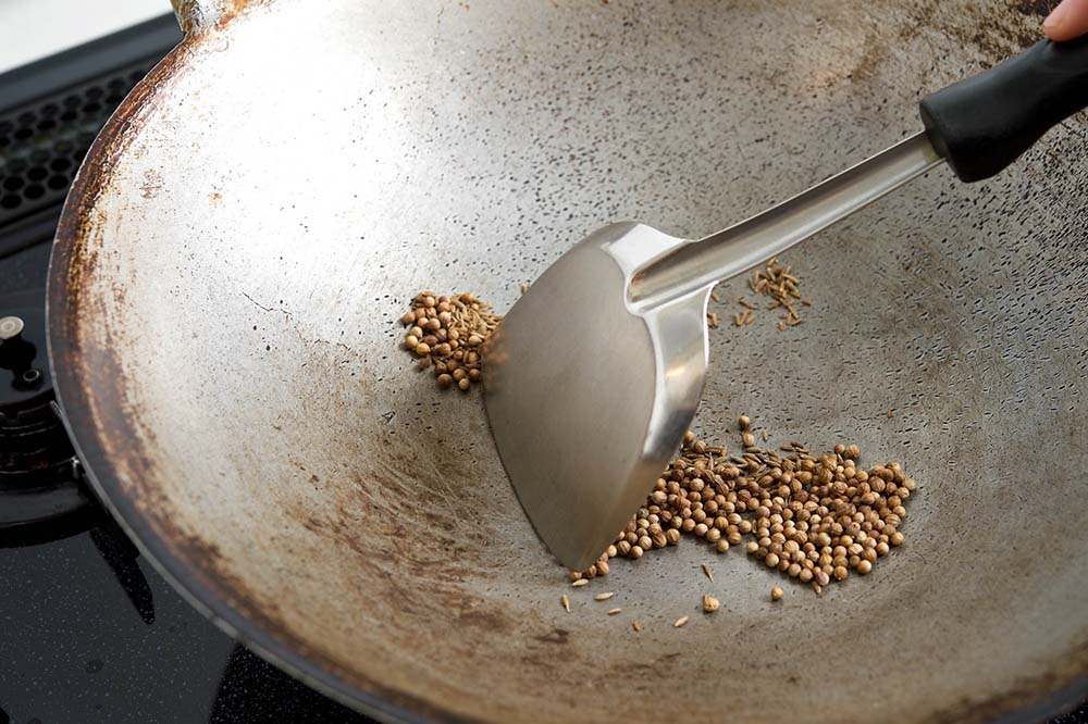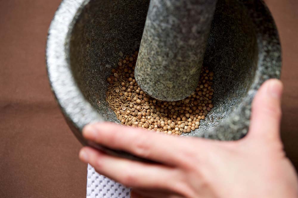 2 スパイスとハーブは、潰す順を守ると滑らかに仕上がる。
