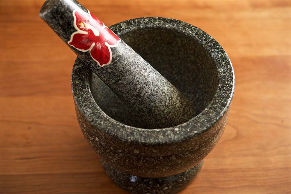 石製のすりこぎ&すり鉢「クロック」で潰す方が粘りも香りも出る。タイ食材店で5000円前後で買える。フードプロセッサーでも可。