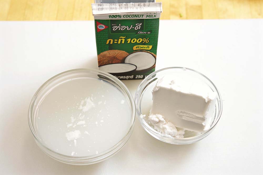 カレーペーストと一緒に使うことが多いココナッツミルク。固体(バター)と液体(それ以外)に分離しているタイプを選び、2つに分けて用いる。