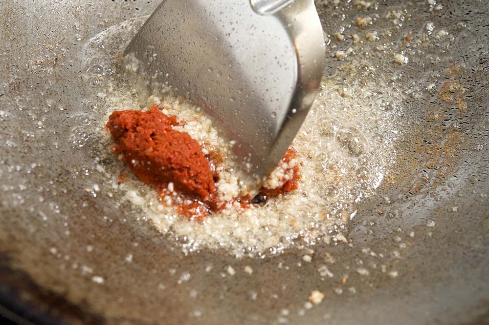 固体分は鍋で透明感が出るまで熱してペーストと一緒に炒めてから、他の具材を加える。