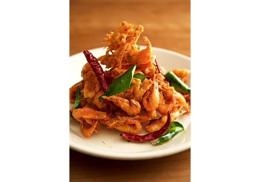 【揚げ物に】川海老のハーブかき揚げ・・・ペーストを混ぜ込んだ衣にくぐらせ、カリッと揚げた川海老は、クリスピーな食感と、弾けるような香りが食欲を刺激する。後を引くおいしさ。