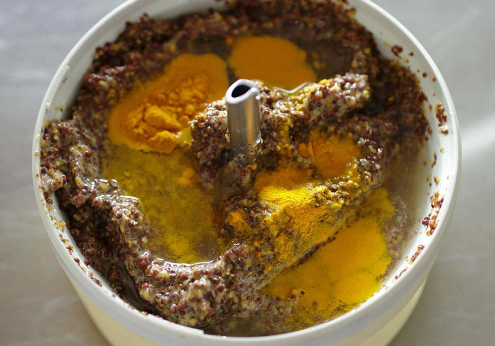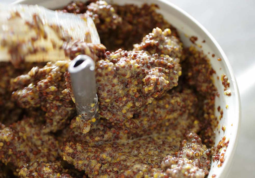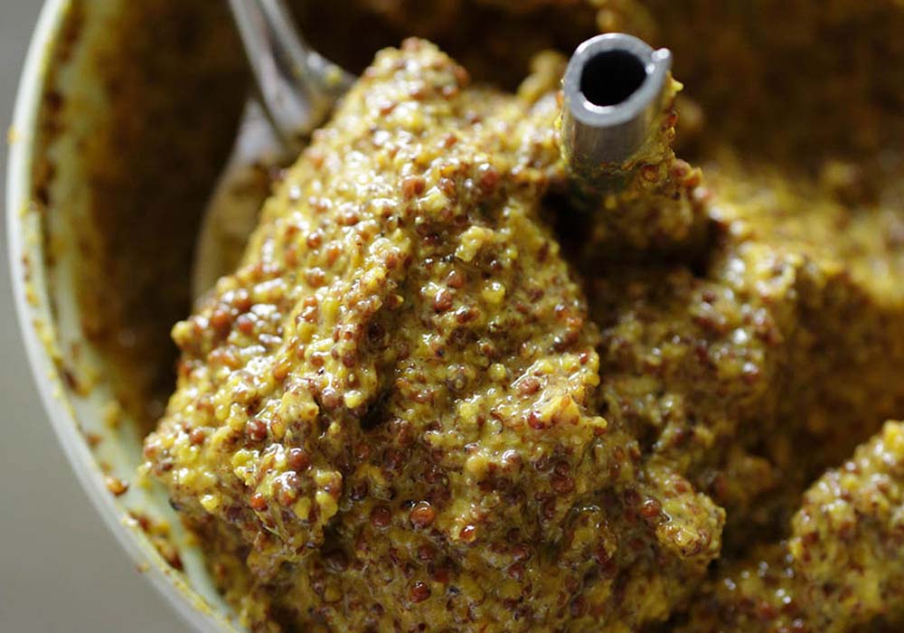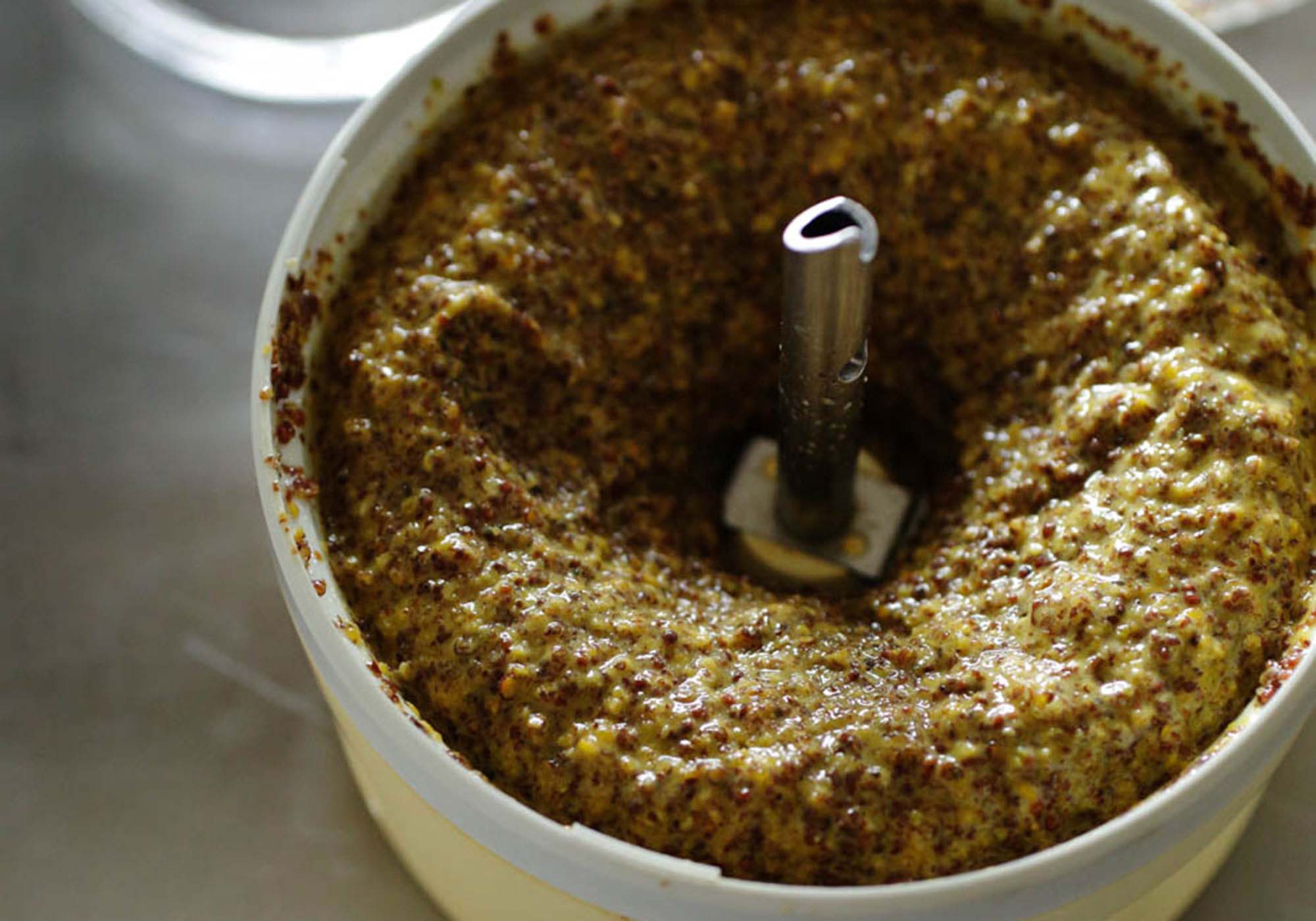 小型のフードプロセッサー、カップ状のブレンダーなどが便利。ない場合は、マスタードを一晩以上ビネガーに漬けてから、すり鉢ですり潰す。粗めだが、存在感のある仕上がりに。