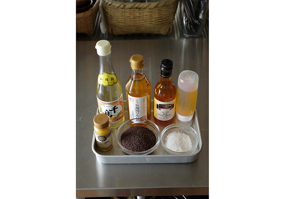 決め手の材料のひとつはビネガーですが、これも使うのは1種類と決めつけずに、すっきりしたものと甘味のあるタイプとを組み合わせたり、ブラウンマスタードならシェリービネガーや赤ワインビネガー、少しバルサミコを加えると、こくのあるマスタードに。