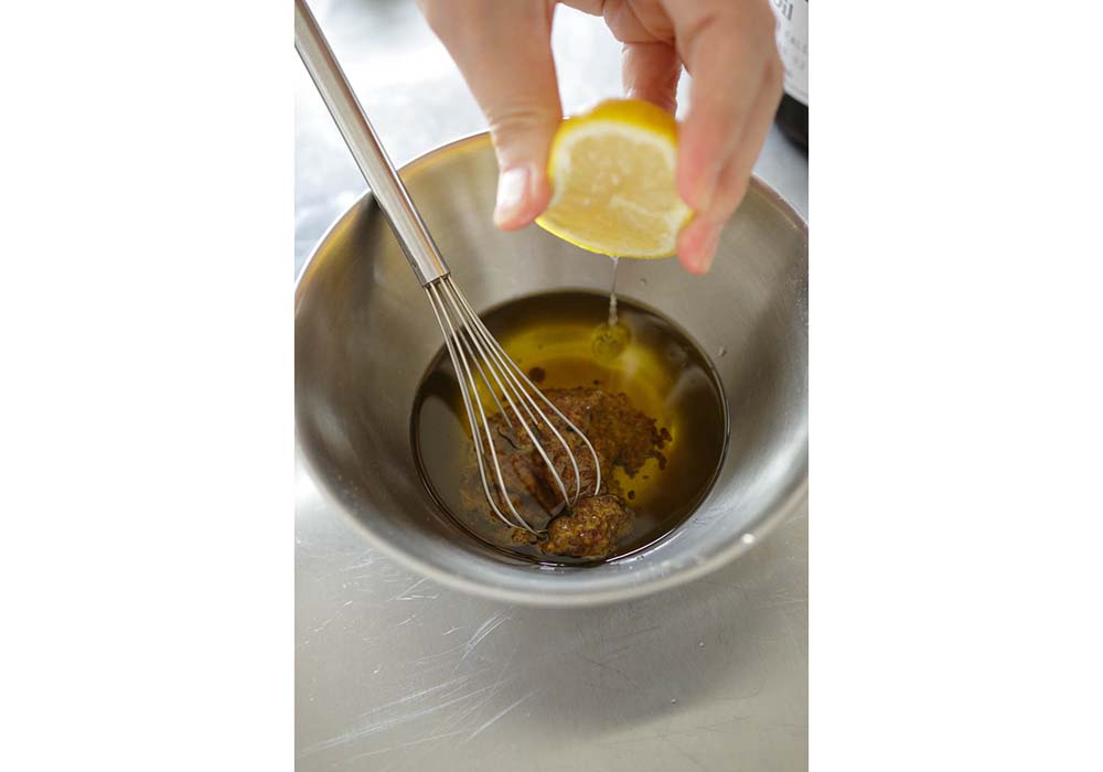 ドレッシングに:ボウルにオリーブ油とマスタード、レモン汁を搾ってよく乳化させる。