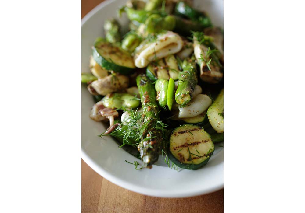 グリル野菜のマスタード風味・・・温かいグリル野菜は程よい歯応えがあって瑞々しい味わい。マスタードドレッシングがほんのり温められるので、主菜的にたっぷり食べたくなる。香ばしい焼き目は視覚だけでなく味のアクセントになる。