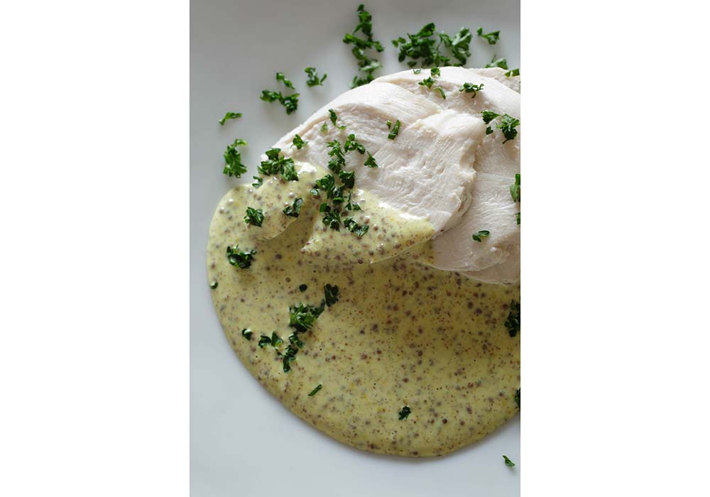 茹で鶏とマスタードソース・・・マスタードと生クリームだけで完成したとは思えないほど、安定感のあるソース。冬は温かい料理として、夏は茹で鶏もマスタードソースも冷やしておいて、冷製として、2通りの愉しみ方ができる。