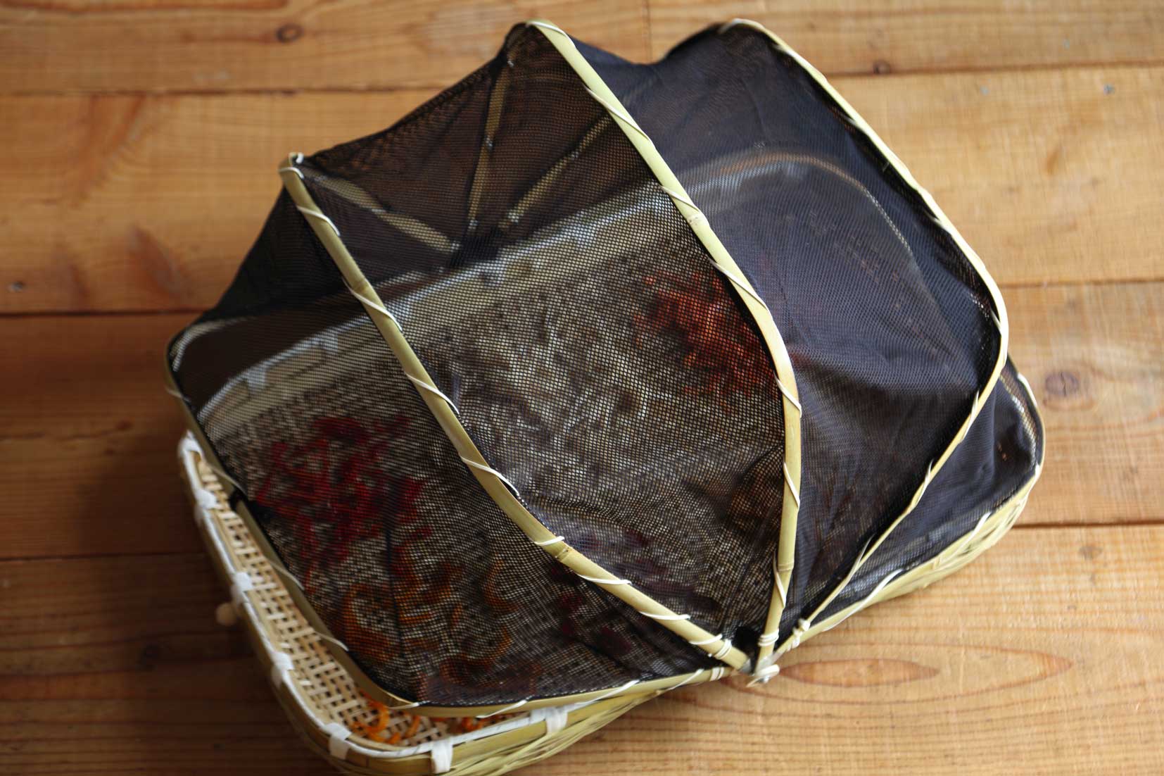 ネット付き干しザル:1台あれば重宝のネット付き竹ザル。普通のザルでも問題ないが、使う前に天日に当てて十分に乾燥させ、カビ防止を。