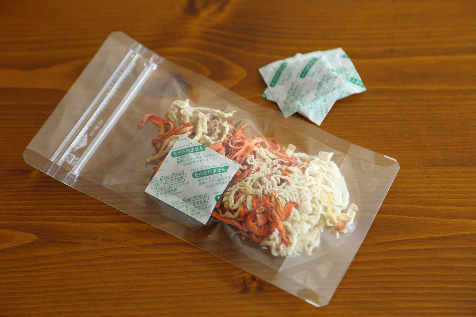 脱酸素剤:保存はチャック付きの冷凍・冷蔵バッグで。脱酸素剤を入れ、空気をしっかり抜くこと。冷凍保存ももちろんOK。