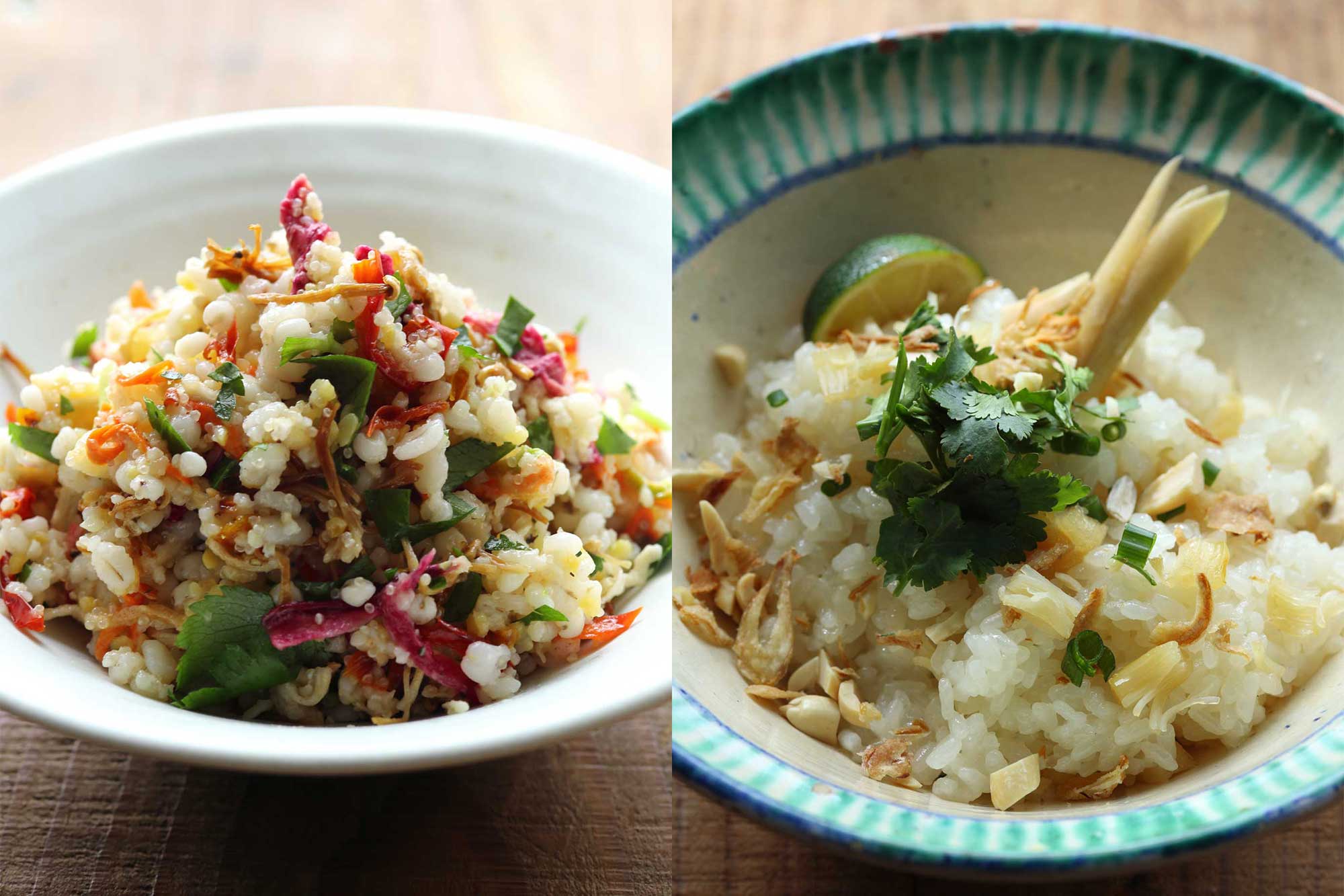 右)ホタテのベトナム風おこわ・・・干して滋味が増したホタテを、ご飯と一緒に炊き込んで。ニョクマムの旨味も隠し味にほんのり。干し貝柱はスープ、お粥の具材に使っても美味。