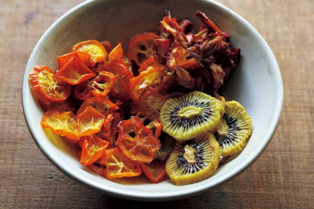 三原流の乾物は、とにかく彩りが美しい。赤カブ、パプリカ、プチトマト、イチゴ、金柑、キウイ。ありがちな茶系ばかりでない、原色の鮮やかさに気分が上がる。カラカラになるまで干したら、保存袋に。半乾きのレア状態を、そのままサラダや和えものに使ってもいい。干し加減を好みに合わせて調整できる自由度の高さは、自家製なればこそ。少々鮮度が落ちていても心配ご無用。逆に水分が早く抜けて、仕上がりは上々だ。