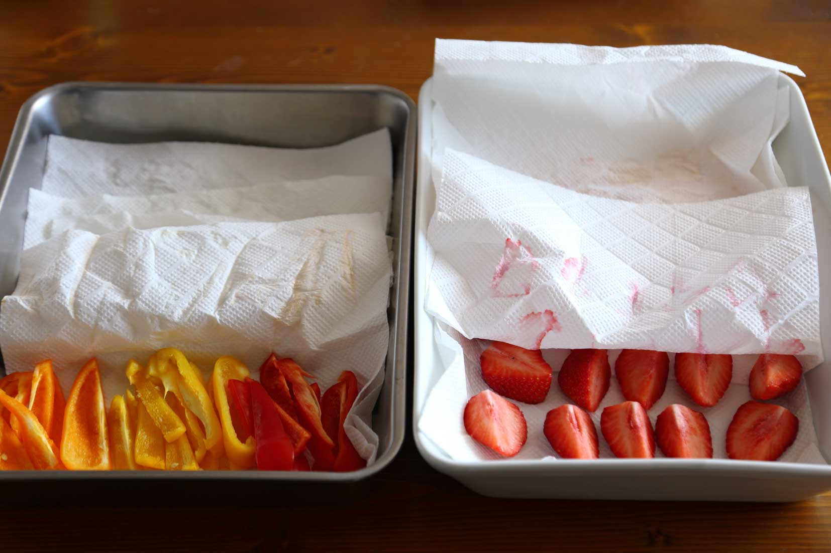 野菜、果物を適当な大きさに切る。イチゴやパプリカ、トマトなど水分を多く含む野菜は、切った後、ペーパータオルで表面の水分を拭き取る。